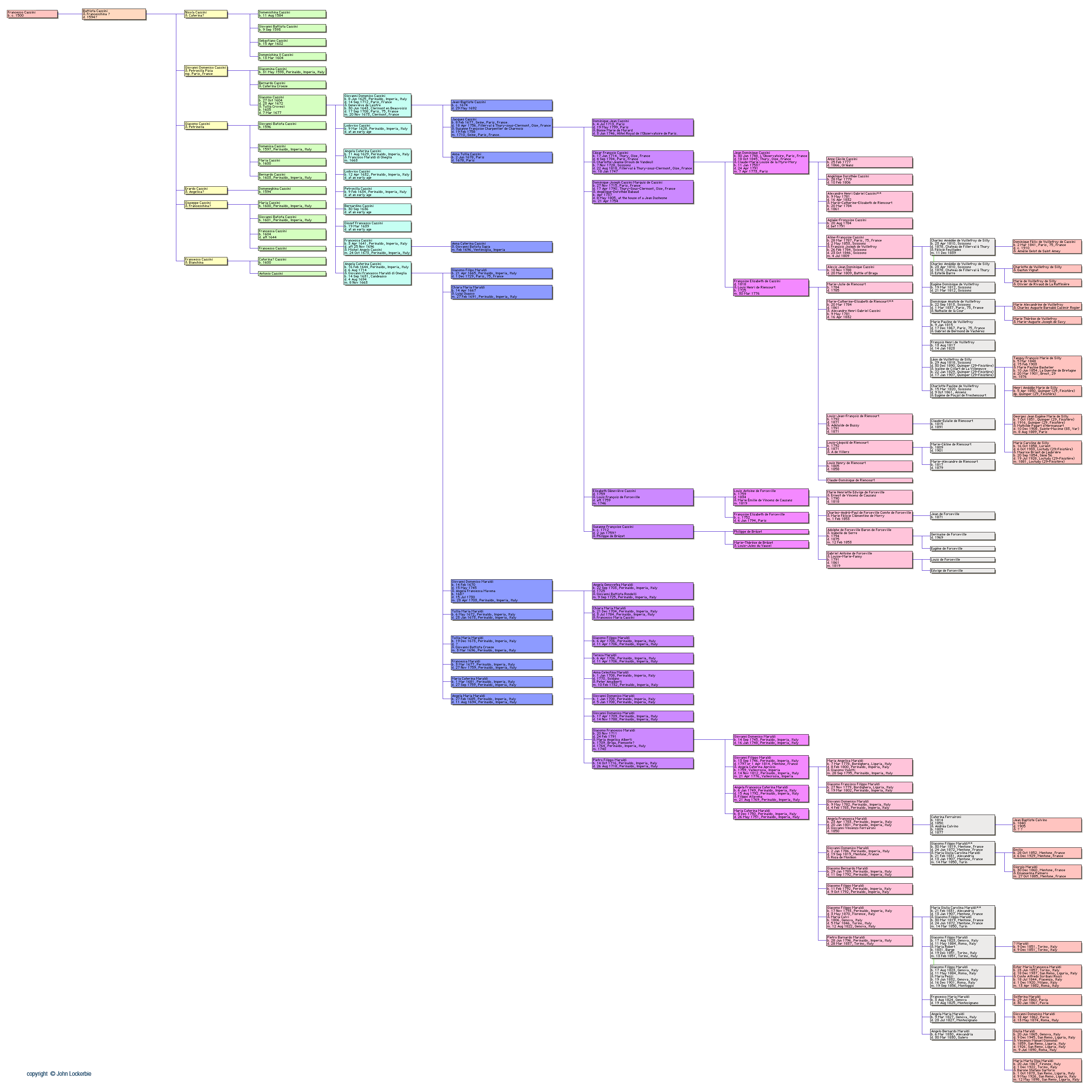 This illustration of the Cassini and Maraldi family tree – which will open in a new window – shows the information I’ve been able to obtain so far. It is now the third iteration of the tree and I believe it is relatively accurate, being based on the two books of Anna Cassini – ‘Gio. Domenico Cassini: Uno scienziato del Seicento’ and ‘I Maraldi di Perinaldo’ together with my own interviews and research in Perinaldo and elsewhere. I do have additional information, including two more generations to add to the eleven shown here, but I have deliberately left the diagram relatively simple. Having said that, I have recently come across information that both differs from and adds to the tree. I shall post it as soon as I can verify which parts of it are accurate, but suspect this state of affairs will continue for the foreseeable future.