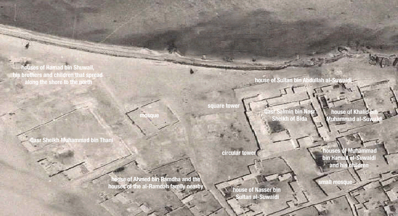 The significant development on the mid-right of the two oblique aerial photographs is that of ‘Salmin bin Nasr Sheikh of al-Bida’, and that to the left – and in a significantly more ruined state – is that of ‘Sheikh Muhammad bin Thani’. Immediately to its right are the ruins of a comparatively large masjid. A smaller masjid is marked in the lower right corner of the photograph.