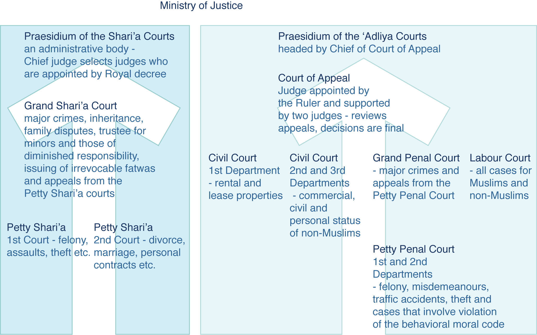 In order to practise, judges in the shar’ia courts are required to have a degree in shar’ia studies from an Islamic school, usually from Saudi Arabia or the al-Azhar university in Cairo. By contrast, judges in the ’adliya courts must have degrees from the law school of an accredited university and have practised for a prescribed number of years. In this they represent the two different characters of shar’ia and ’adliya: essentially the application of the word of God, and the rules of conduct based on a developed notion of justice, respectively.